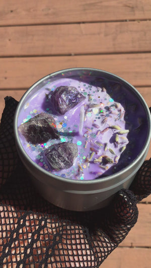 Amethyst and Lavender soy wax aromatherapy candle. Indulge in the tranquil and restorative properties of our Amethyst and Lavender Soy Candle. Handmade with organic soy wax, untumbled amethyst crystal, and fragrant dried lavender flowers, this aromatherapy candle is a must-have for promoting a serene and peaceful atmosphere in your work environment, business, or in your household. Lightly Infused with the soothing & calming aroma of lavender essential oil, this crystal-infused candle is an ideal, one-of-a-kind gift for anyone who loves aromatherapy.